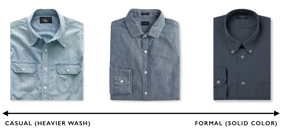 This illustration shows that as a chambray shirt gets darker, it generally looks more formal. As you shop for a chambray shirt, consider what style will give you the most bang for your buck in your wardrobe.