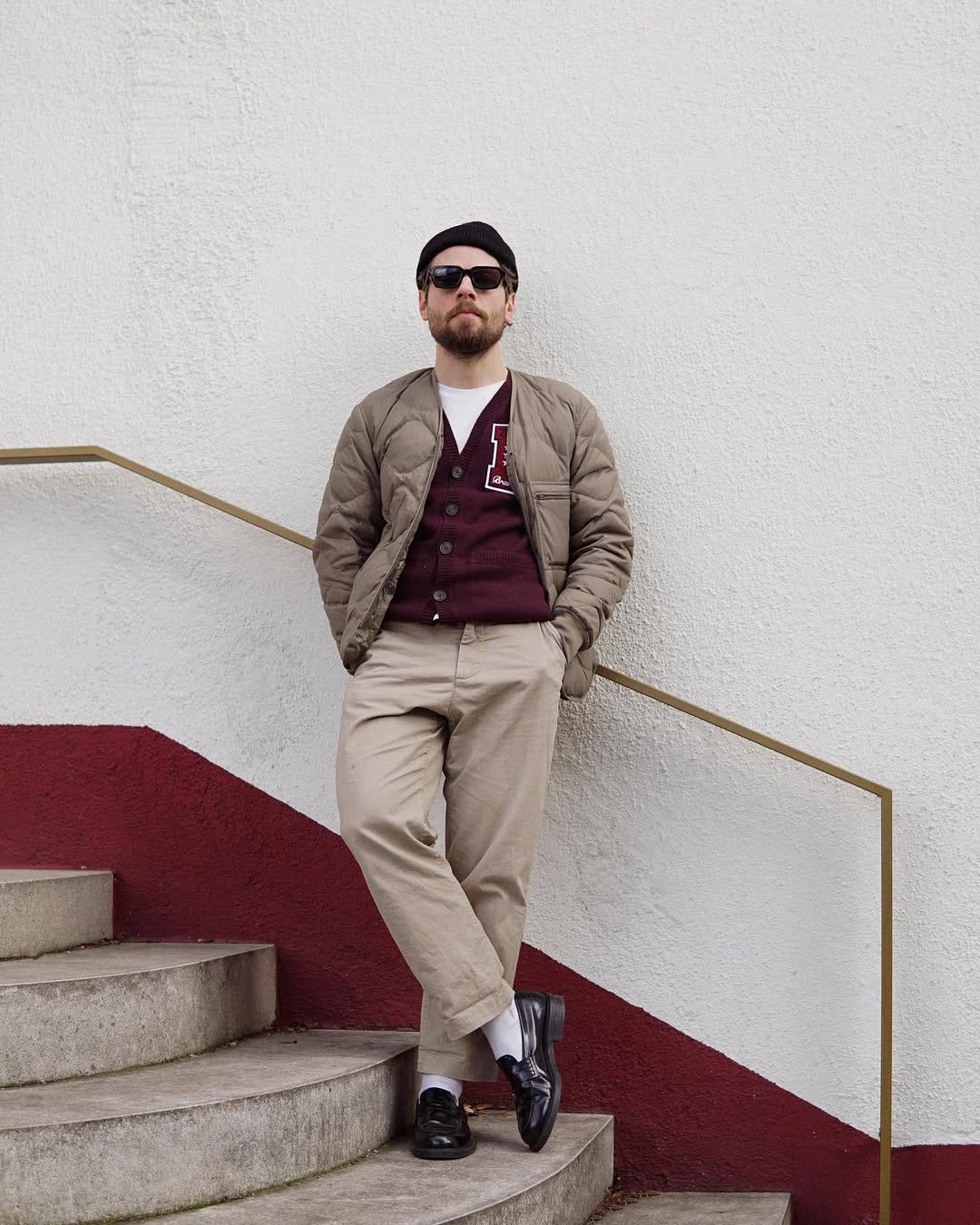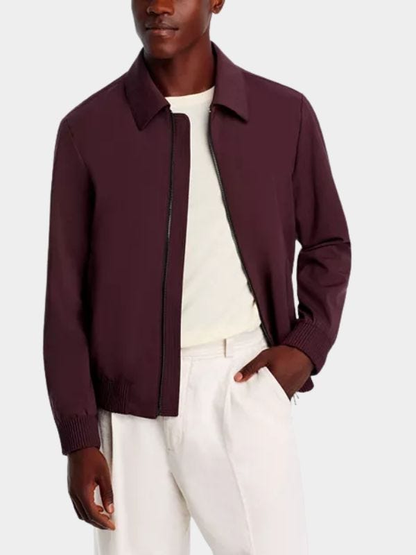This is the way to bring black cherry into spring — by pairing the color with tan chinos, light jacket and a brown loafer.