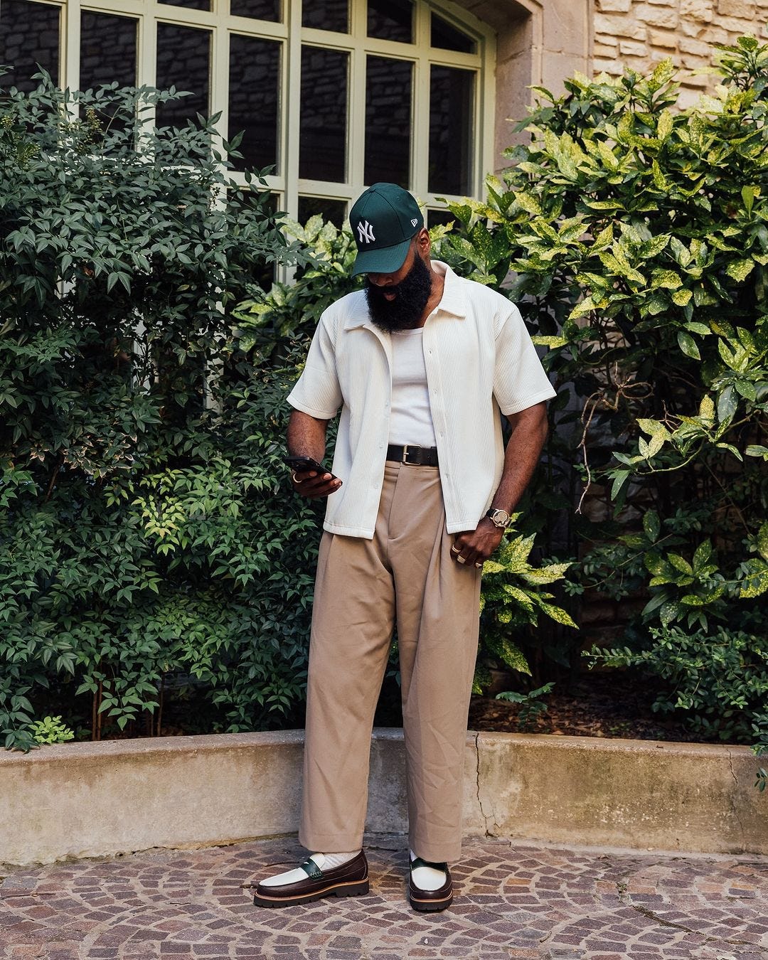The shoes you wear will cement which side of the casual-to-dressy continuum you land on. Finish off the look with casual sneakers, and the overall effect will be breezy cool. Go with a more formal shoe like a lace-up or loafer, and you’ll easily be able to pull off the outfit at the office.